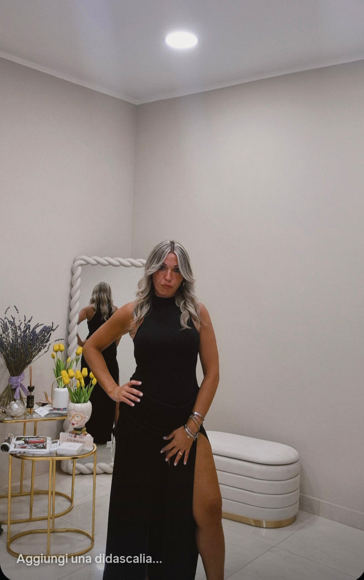 Questo abito lungo valorizza la silhouette con una vestibilità che aderisce perfettamente alle forme, enfatizzando la figura con eleganza. Il dettaglio distintivo è lo spacco laterale alto che aggiunge un tocco di audacia senza rinunciare alla raffinatezza, rendendo il capo ideale per chi desidera farsi notare con stile.
