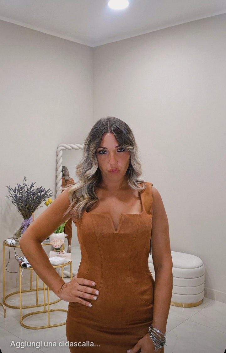 L’abito Katia è un capo raffinato realizzato in camoscio, pensato per valorizzare la silhouette grazie a una vestibilità che segue armoniosamente le forme del corpo. Il suo punto di forza è lo scollo particolare sul décolleté, che dona un tocco di eleganza e originalità, perfetto per chi cerca un equilibrio tra stile sofisticato e femminilità. Ideale per occasioni speciali dove distinguersi con discrezione e charme.