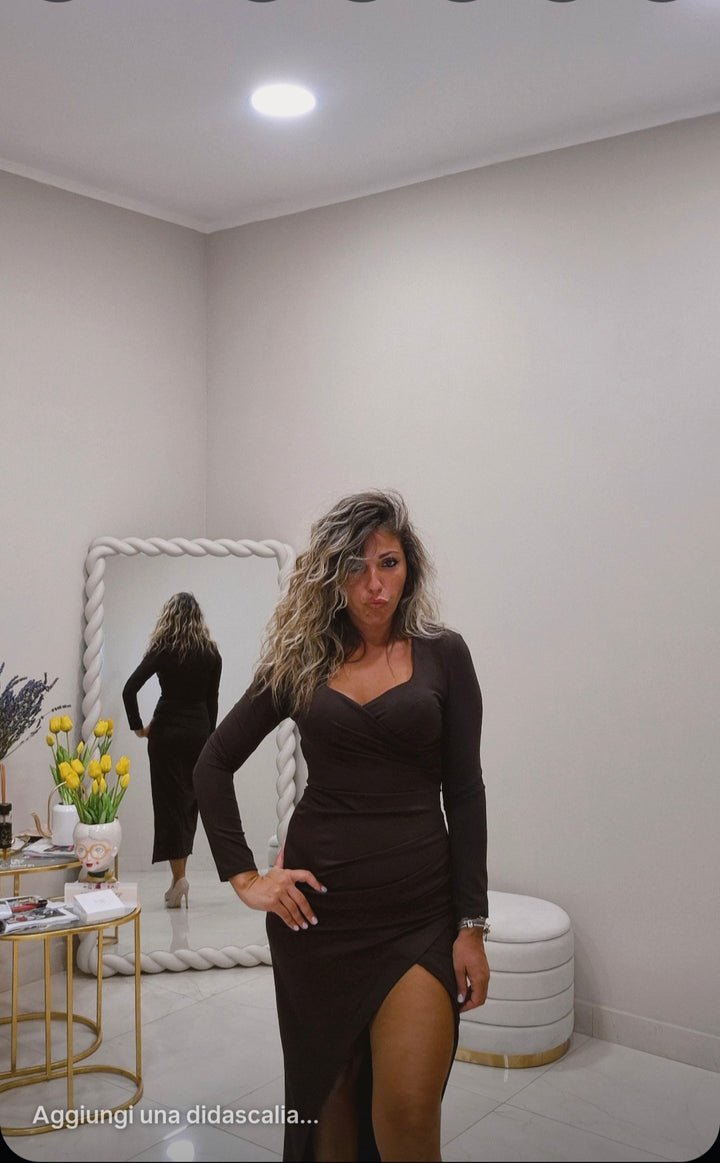 L'abito Melissa valorizza la silhouette grazie a un taglio lungo che avvolge delicatamente le forme. Lo spacco frontale aggiunge un tocco di eleganza sofisticata, mentre lo scollo ben studiato mette in risalto il décolleté con naturale raffinatezza. Perfetto per chi cerca un equilibrio tra stile classico e dettagli contemporanei.