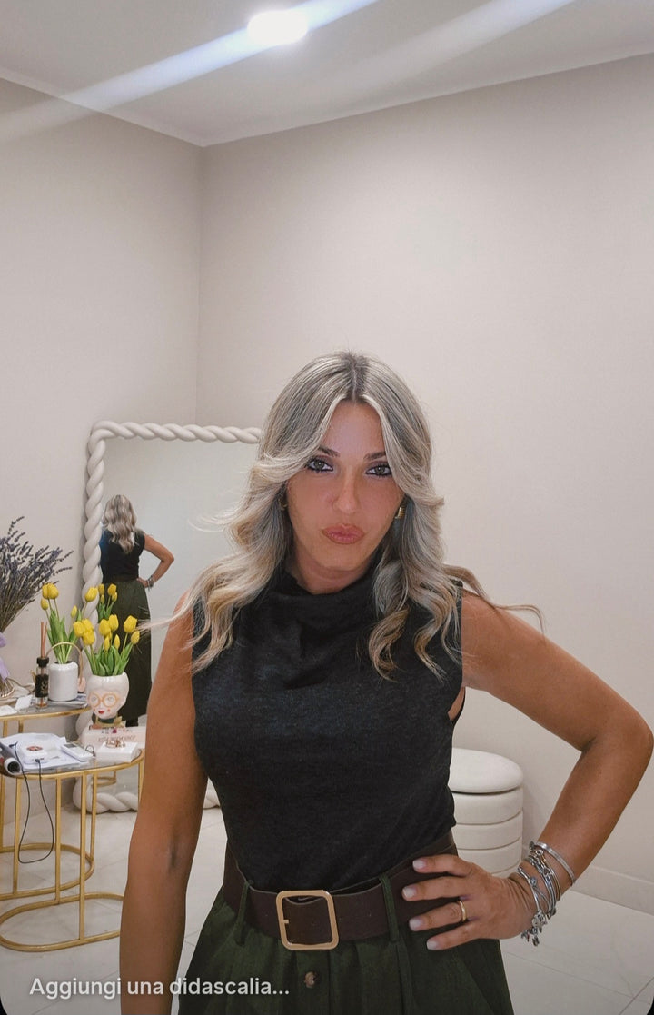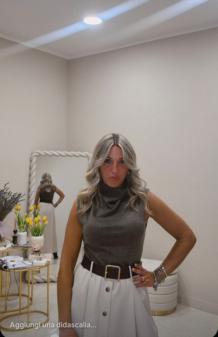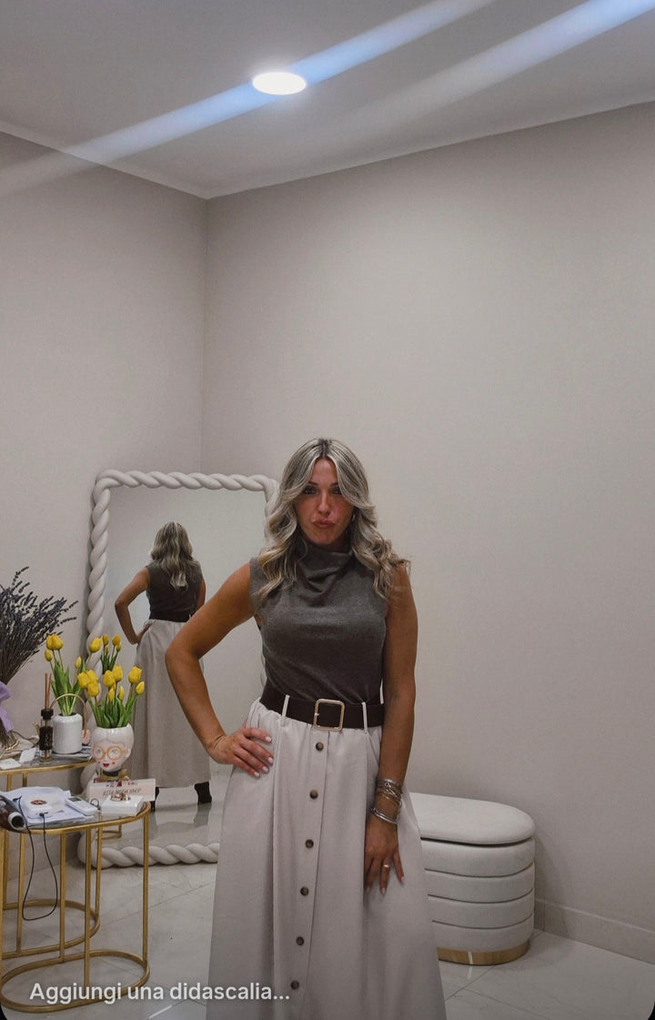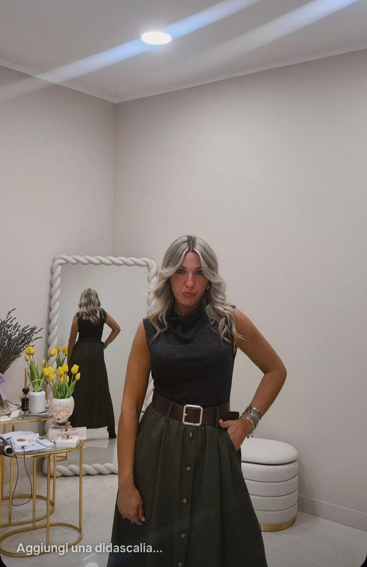 Questo abito lungo presenta un collo a mezzo giro e un cinturone in vita che valorizza delicatamente il punto vita. Il gonnellone scende morbido, assicurando una silhouette elegante e fluida. Perfetto per chi cerca uno stile raffinato e contemporaneo, questo capo unisce comfort e moda senza tempo, adatto a diverse occasioni.
