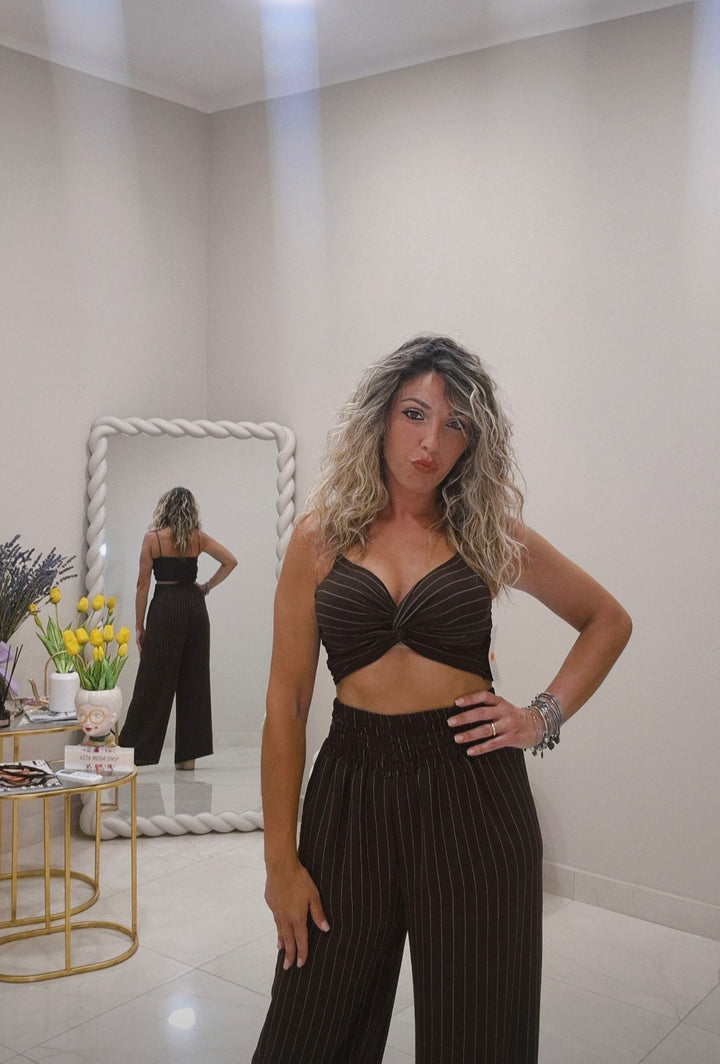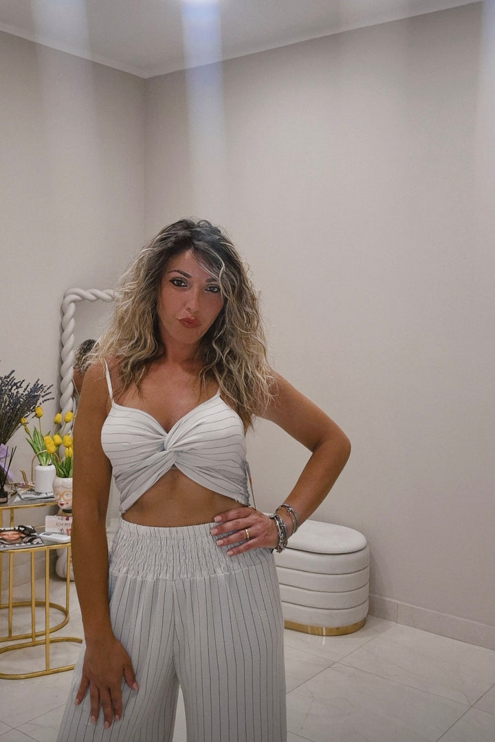 Il coordinato estivo Ariel è l’ideale per le serate calde, composto da pantaloni con elastico in vita per una vestibilità confortevole e un top corto con imbottitura che valorizza la silhouette. Questo set unisce comfort e stile, diventando un must-have per un look estivo elegante e pratico.