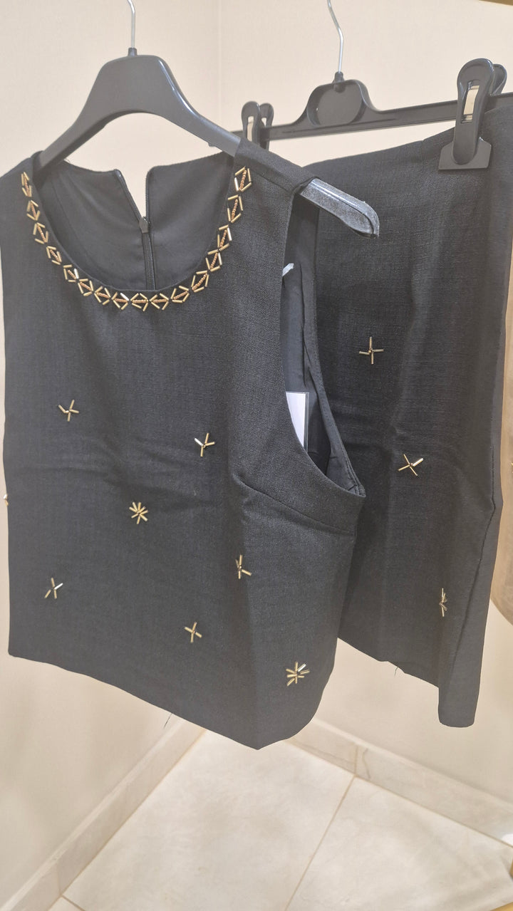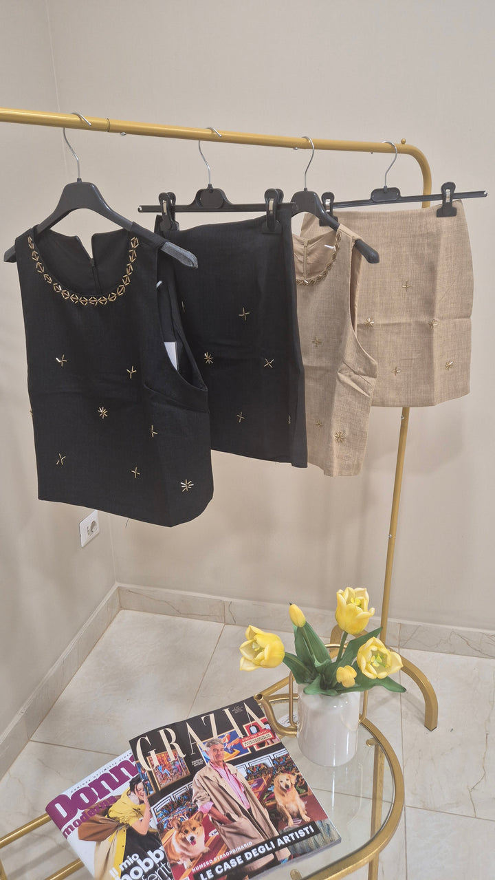 Questo coordinato Dalila è perfetto per chi cerca un look elegante e sofisticato. La gonna corta e il top con applicazioni in oro aggiungono un tocco di classe al tuo outfit, facendoti risaltare in ogni occasione. Scopri subito il suo stile unico e non passare inosservata.