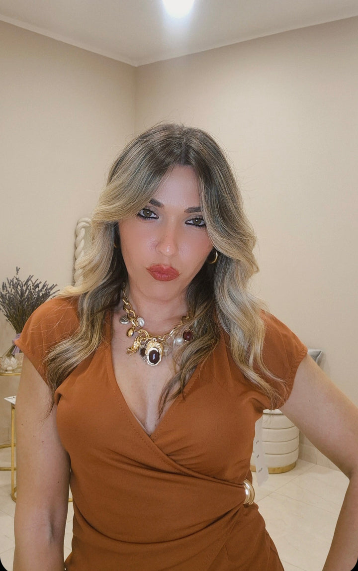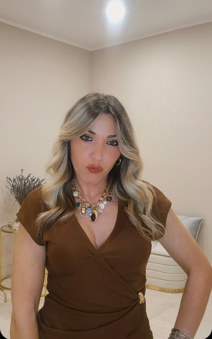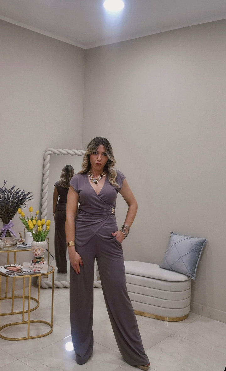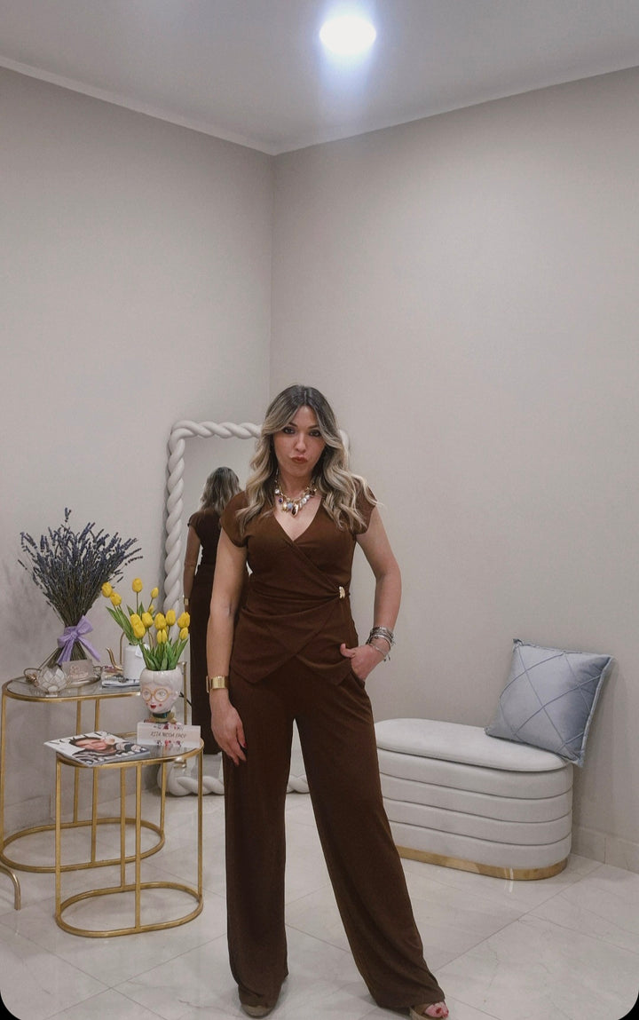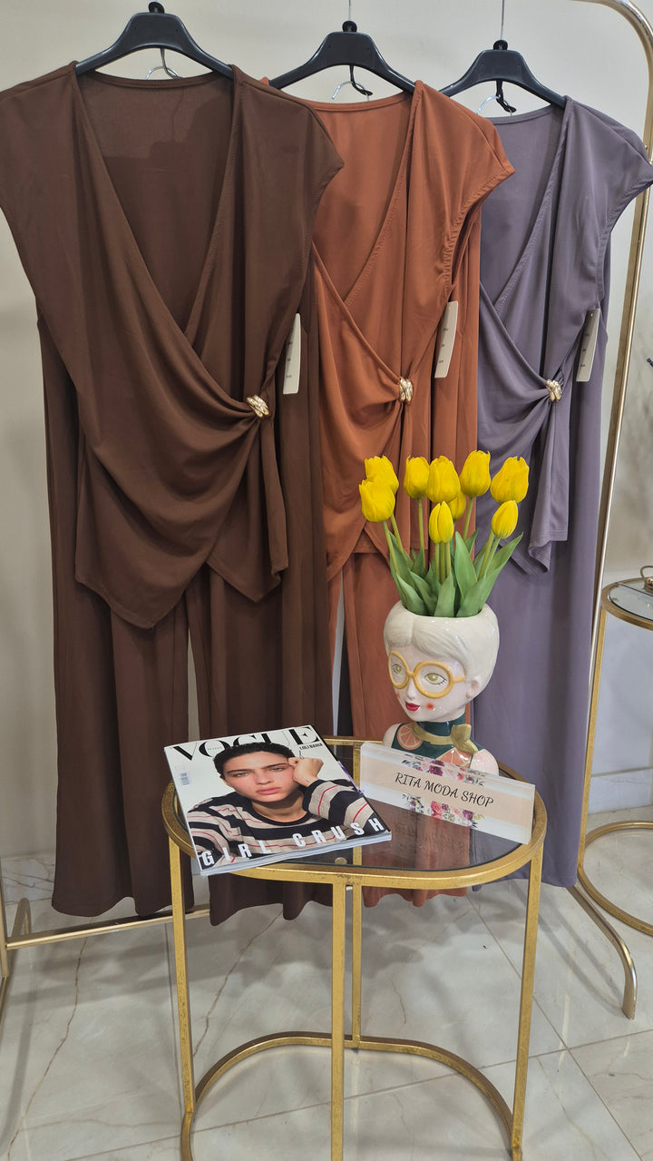 Coordinato Dalila, un ensemble sofisticato che unisce eleganza e raffinatezza. Il pantalone dalla linea impeccabile si abbina perfettamente alla maglia con design incrociato che valorizza il décolleté con discreta sensualità. Realizzato con tessuti pregiati che garantiscono vestibilità ottimale e comfort duraturo, questo coordinato rappresenta la scelta ideale per occasioni che richiedono un'eleganza distintiva.