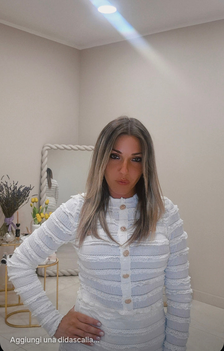 Il coordinato Diana è una scelta raffinata per chi cerca eleganza e stile. La gonna lunga, arricchita da uno spacco posteriore, valorizza la figura con un tocco di sensualità discreta, mentre la maglia effetto giacca corta dona un’allure sofisticata e contemporanea. Perfetto per occasioni in cui desideri un look definito e impeccabile.