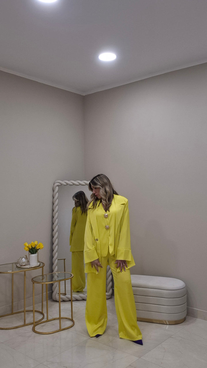 Questo coordinato pantalone e gilet è perfetto per un look elegante. Con l'applicazione di due bottoni in oro, l'outfit diventa ancora più sofisticato. Aggiungendo la giacca, sarai unica e sofisticata