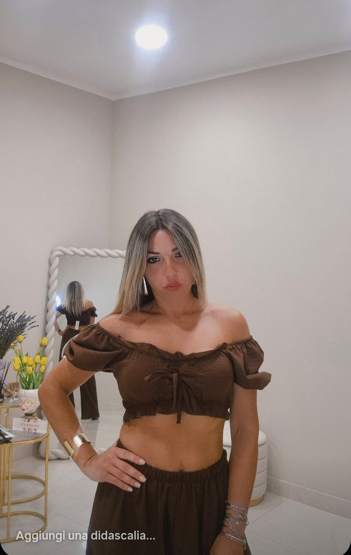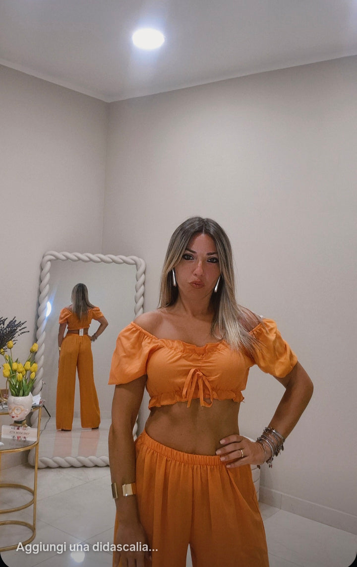 Il Coordinato Giorgy è la scelta ideale per l’estate, unendo stile e comfort. Il pantalone con elastico garantisce una vestibilità perfetta e una comodità senza pari, mentre il top corto con scollo a barca aggiunge un tocco di eleganza e freschezza. Perfetto per chi cerca un outfit versatile e raffinato nelle giornate più calde.