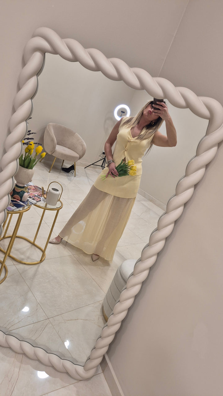 Rendi il tuo look incredibile con il Coordinato Giulietta! La gonna lunga trasparente dal ginocchio alla caviglia e il gilet con due bottoni ti faranno sentire sicuramente alla moda e di tendenza. Aggiungi uno stile strepitoso al tuo guardaroba con questo coordinato dall'aspetto unico e raffinato.