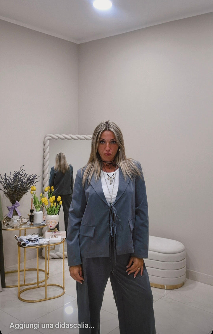 Il coordinato Jad si distingue per un design versatile e confortevole, ideale per ogni occasione. Il pantalone con molla e ampia vestibilità assicura comfort e libertà di movimento, mentre la giacca con laccetti regolabili permette una vestibilità personalizzata e raffinata. Questa combinazione unisce funzionalità ed eleganza, offrendo un look curato e impeccabile in ogni contesto, dal quotidiano agli eventi più formali.