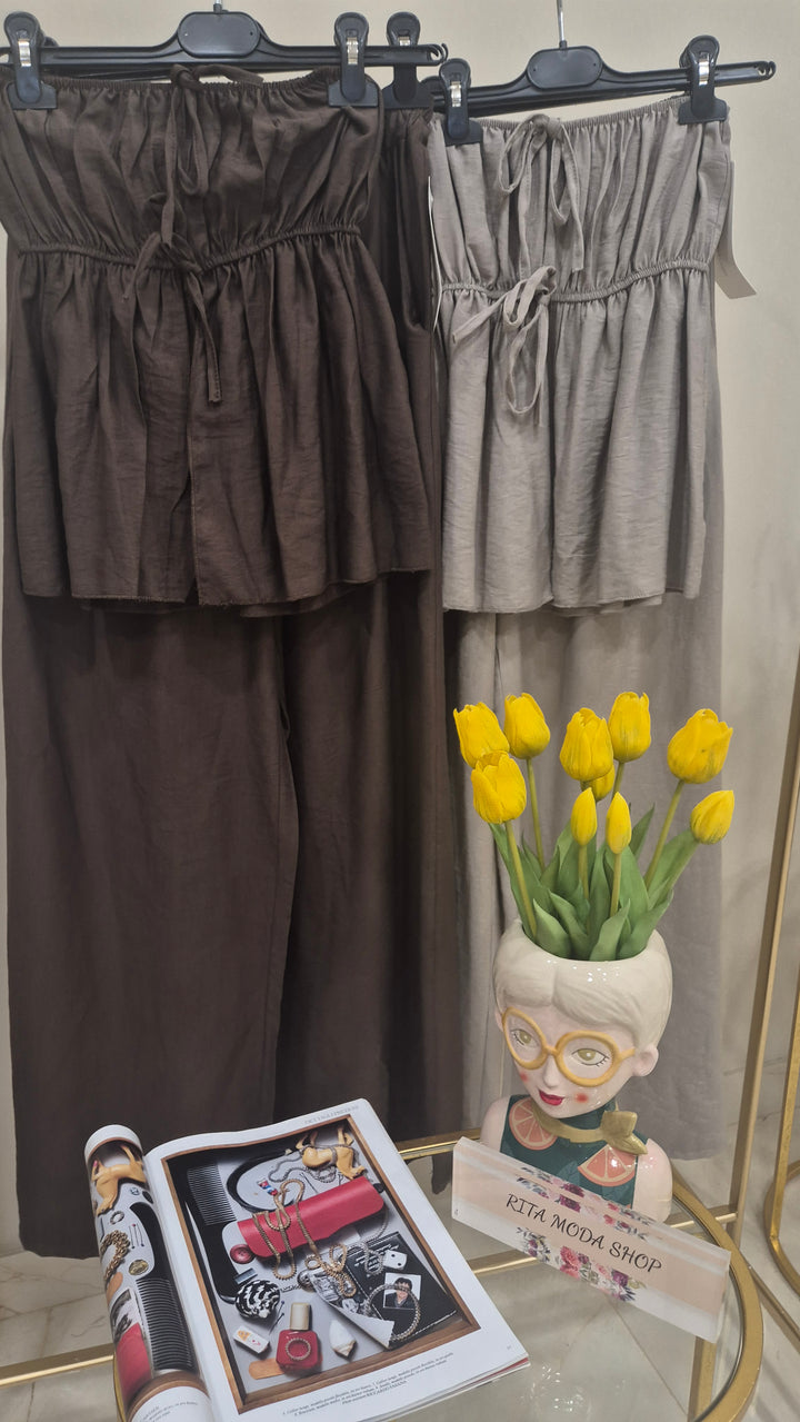 Il coordinato Polly unisce stile e comfort con un design fresco e contemporaneo. Il pantalone con elastico in vita garantisce una vestibilità comoda e adattabile, mentre il top a fascia con apertura sulla pancia aggiunge un tocco di originalità e femminilità. Perfetto per le giornate estive, questo completo valorizza la silhouette mantenendo una sensazione di leggerezza e freschezza.