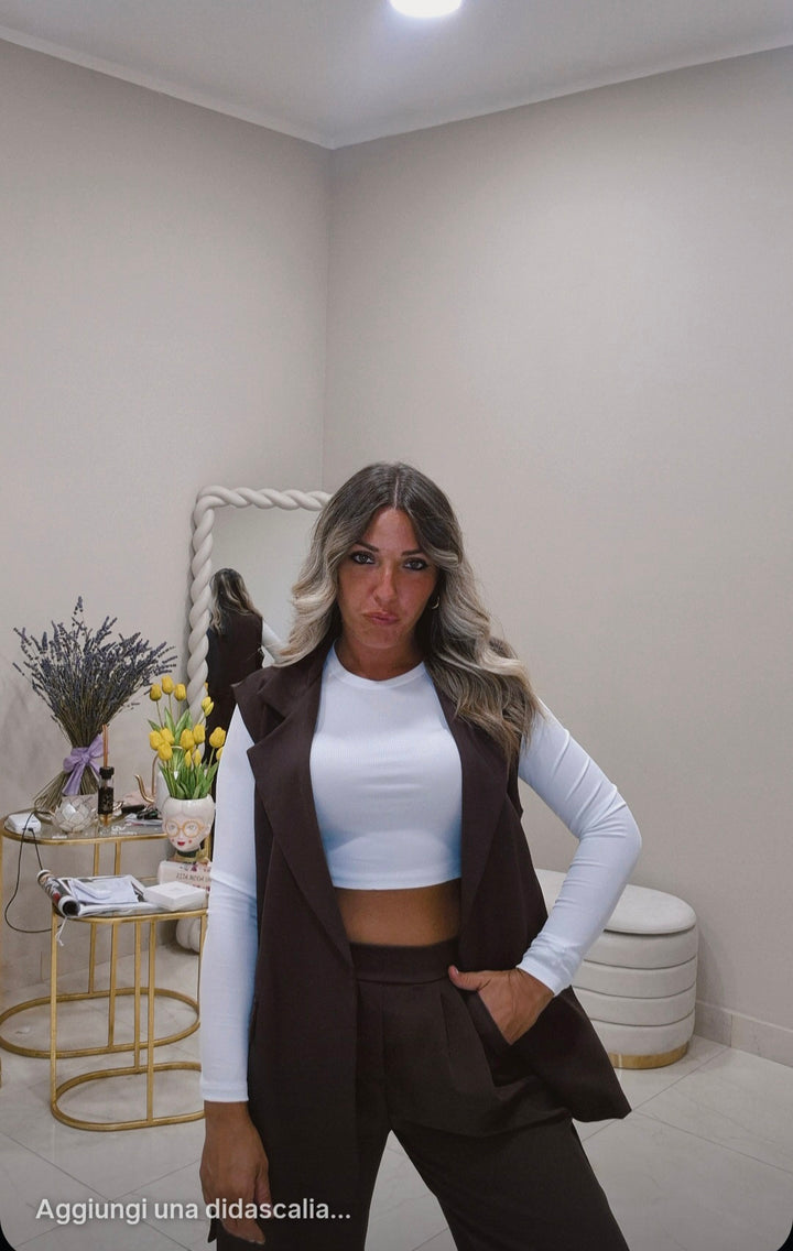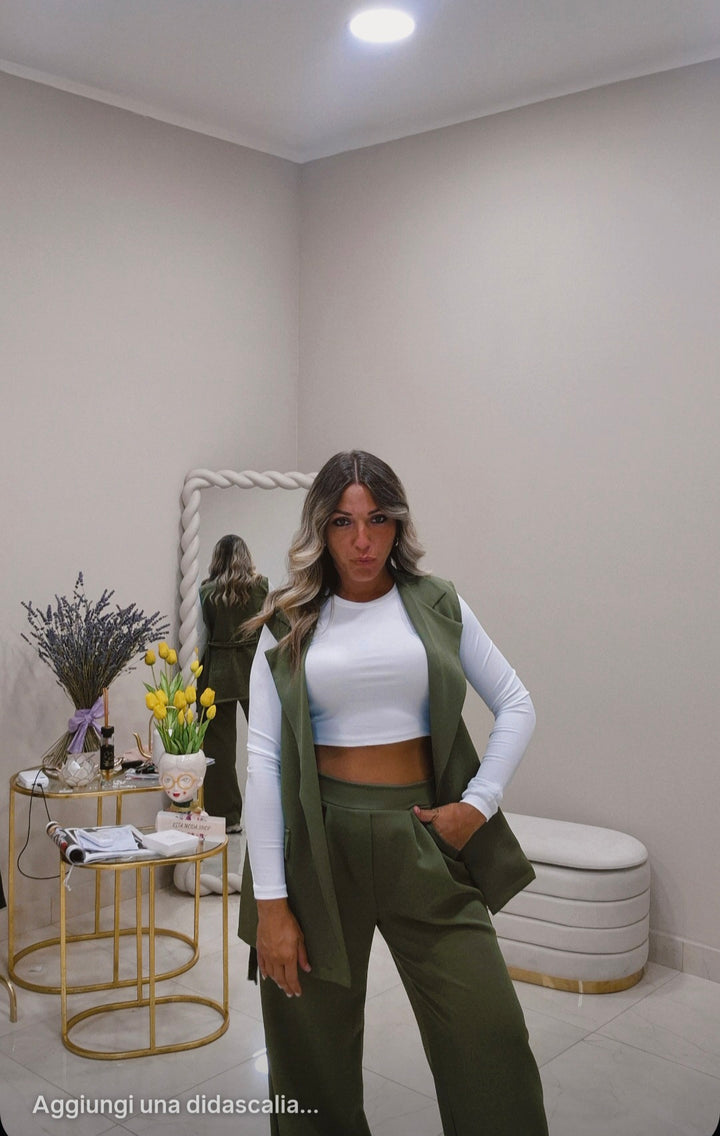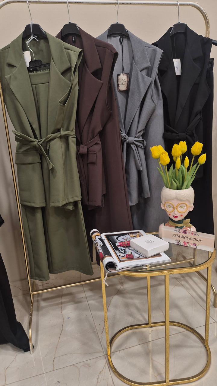 Il Coordinato Syria è la scelta ideale per affrontare i primi freschi con stile e comfort. Composto da un pantalone con elastico in vita che garantisce una vestibilità morbida e adaptable, e da un gilet lungo con cintura che aggiunge un tocco elegante e raffinato. Perfetto per chi cerca un outfit pratico ma curato, capace di mantenere il giusto equilibrio tra comodità e design.