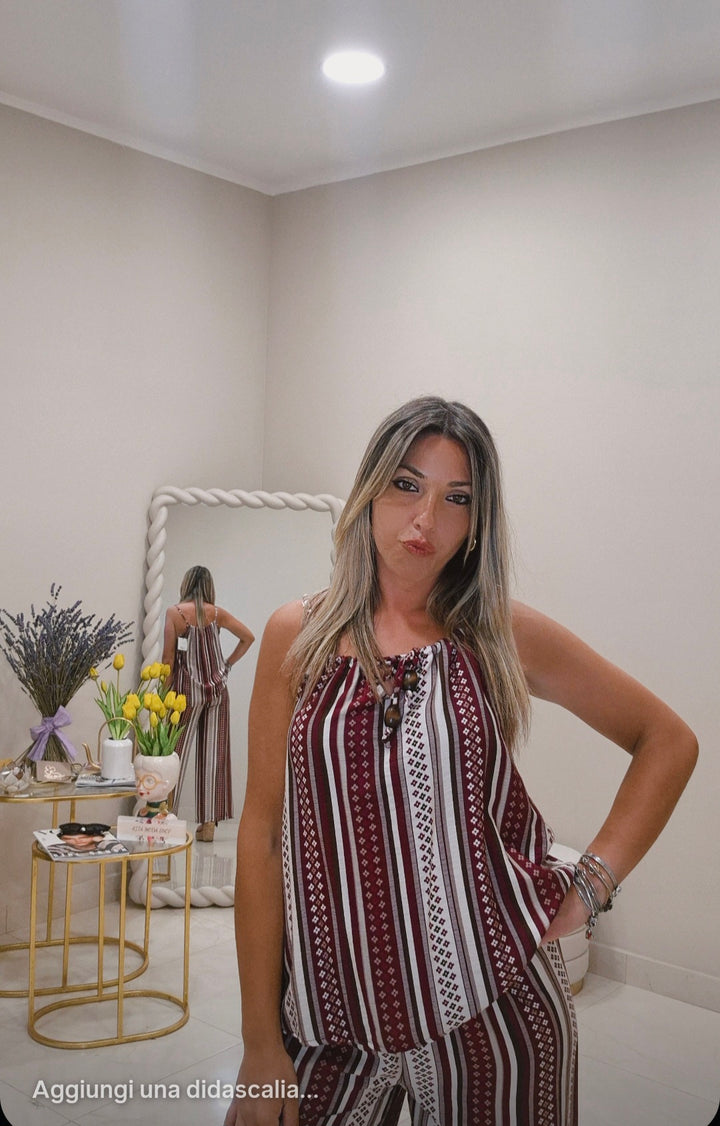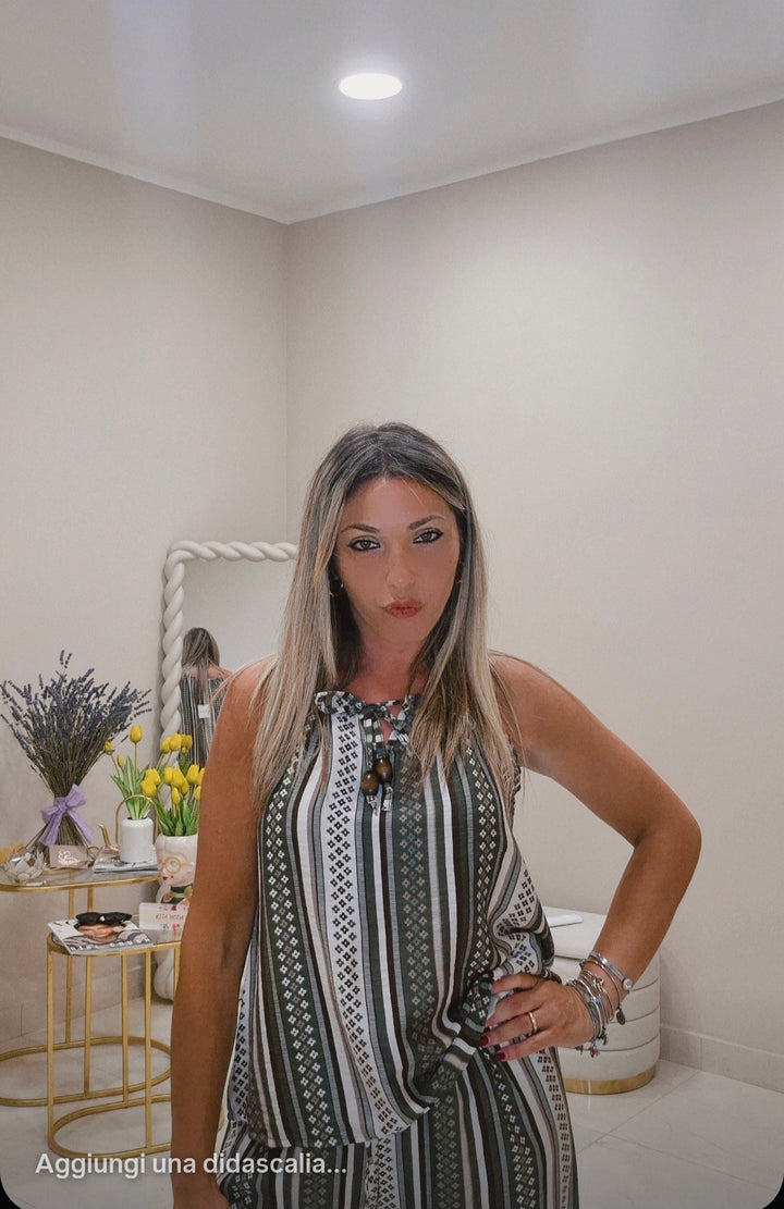 Il Coordinato Tunk in fresco cotone unisce comfort e stile: pantaloni con elastico in vita per una vestibilità rilassata e top regolabile al collo con laccetti, perfetto per mantenere freschezza e moda durante le giornate calde. Veste fino a una 46/48.