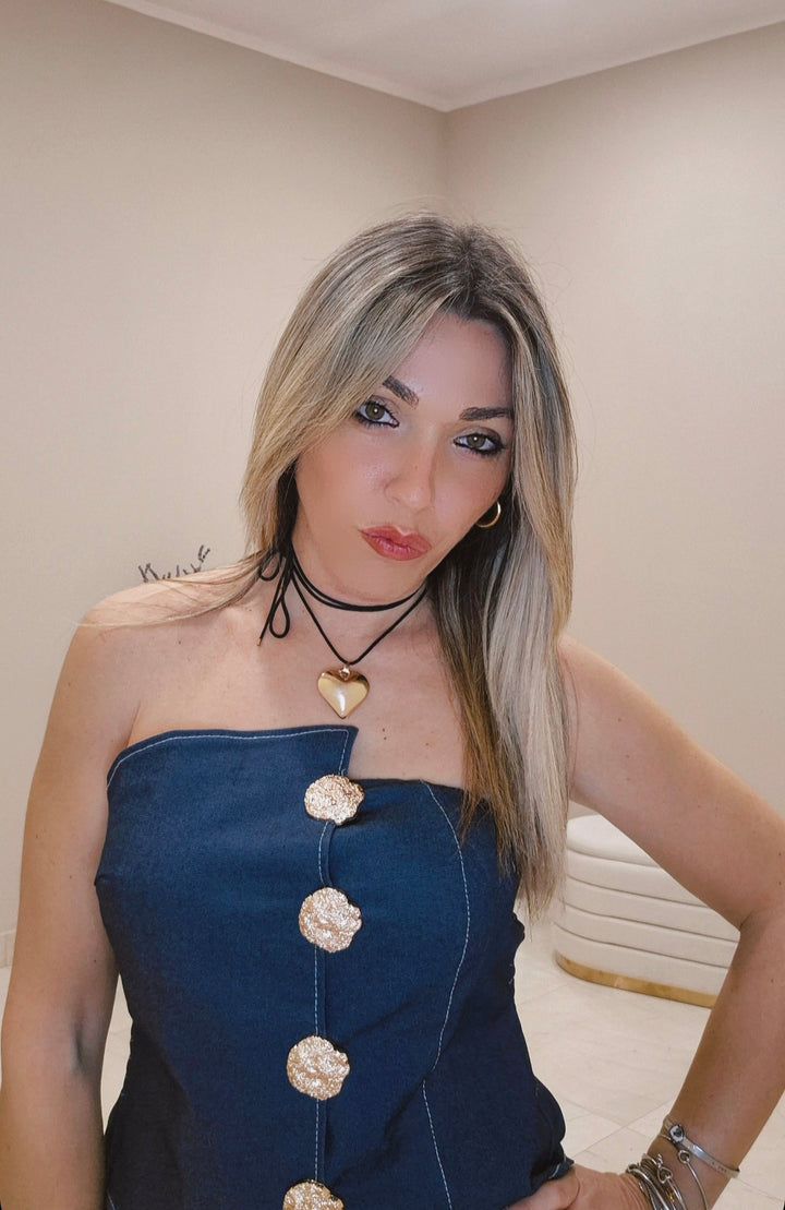 Questo coordinato wow è composto da una gonna a pantaolocino e un top a fascia, entrambi in jeans con particolari bottoni eleganti. Il look perfetto per essere sempre alla moda e trendy con un tocco di eleganza. Affidati a questo coordinato per un outfit impeccabile.