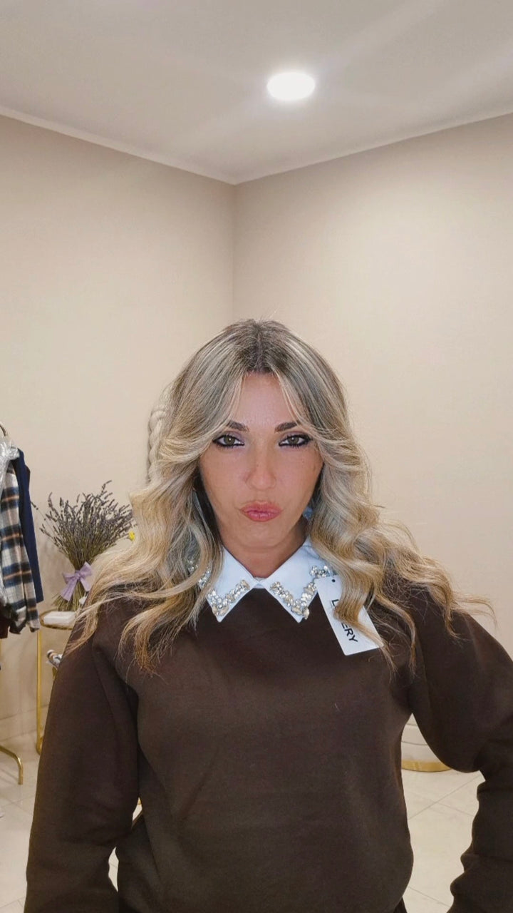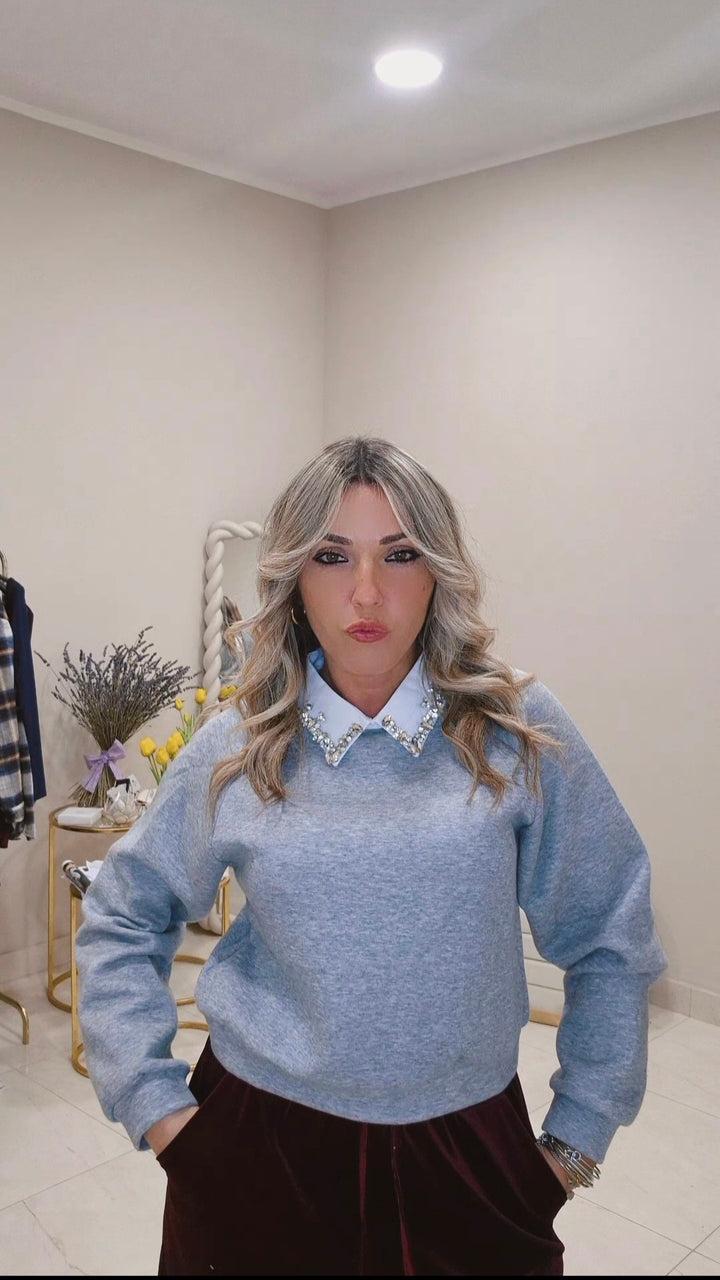 Felpa camicia: la reinterpretazione contemporanea del classico. Questo capo affascinante fonde la comodità di una felpa con l'eleganza di una camicia, grazie al colletto strutturato che ne definisce il carattere. I dettagli in strass applicati con precisione trasformano il collo in un elemento di lusso, catturando la luce e aggiungendo una nota di raffinatezza. La silhouette moderna e il trattamento decorativo la rendono ideale per chi desidera distinguersi con stile consapevole. Un pezzo versatile che eleva qualsiasi look, perfetto per occasioni che richiedono un tocco di glamour senza rinunciare al comfort.