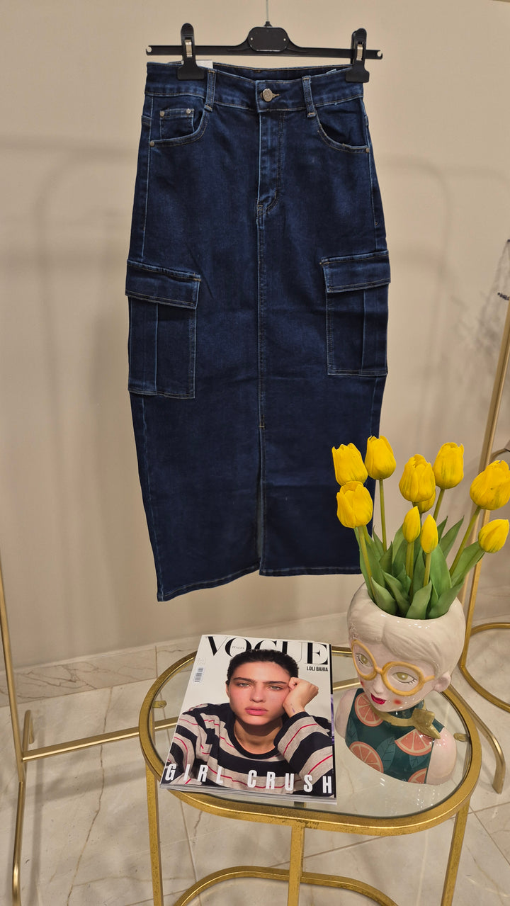 Questa gonna lunga in denim presenta uno spacco centrale e tasconi laterali, perfetta per essere moderna e alla moda. Realizzata con materiali di alta qualità, offre un design unico e un look elegante. Rendi il tuo outfit più originale con questa gonna lunga e pratica!