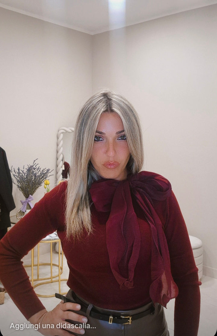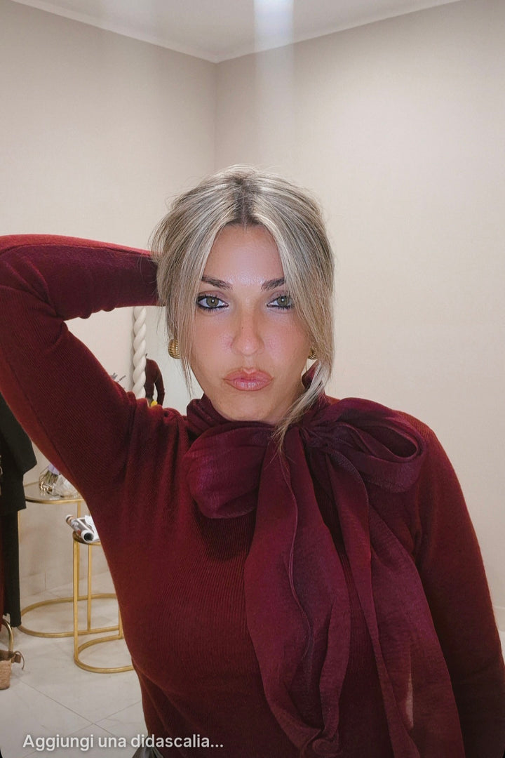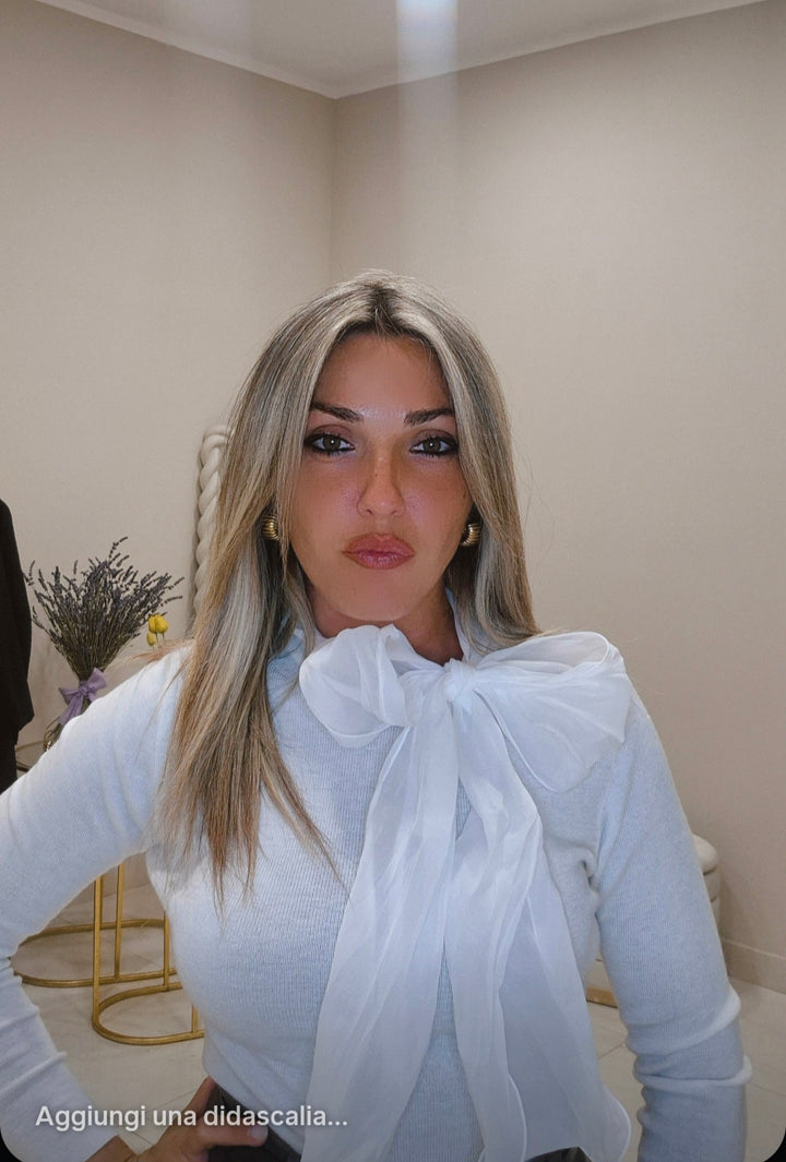 Questa maglia si distingue per una vestibilità impeccabile e un dettaglio raffinato: un elegante fiocco sul collo che conferisce un tocco di raffinatezza al tuo look. Perfetta per chi cerca un capo versatile capace di valorizzare outfit chic e unici.