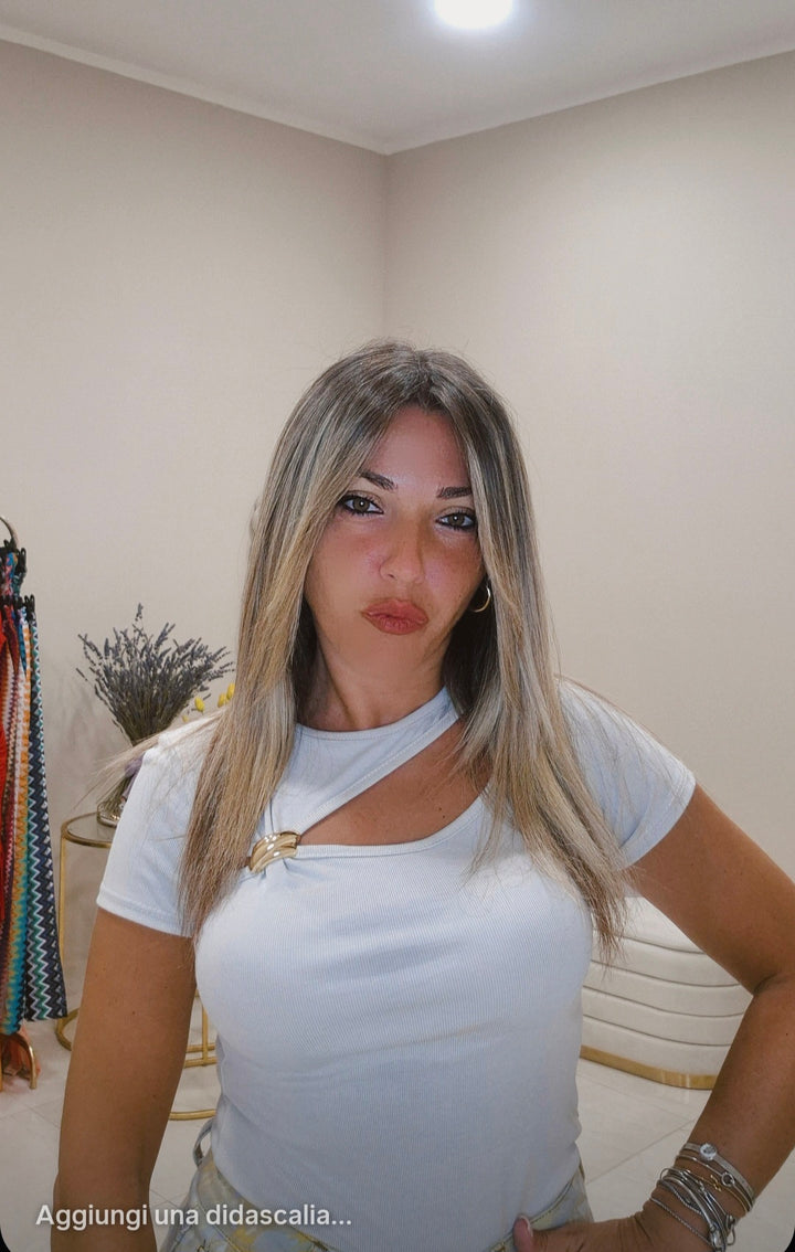 Maglia Sonia combina semplicità e raffinatezza grazie a uno scollo distintivo impreziosito da un gioiello laterale. Questo dettaglio unico trasforma un capo essenziale in un elemento versatile, perfetto per ogni occasione, dal quotidiano agli eventi più informali, garantendo sempre un tocco di eleganza discreta.