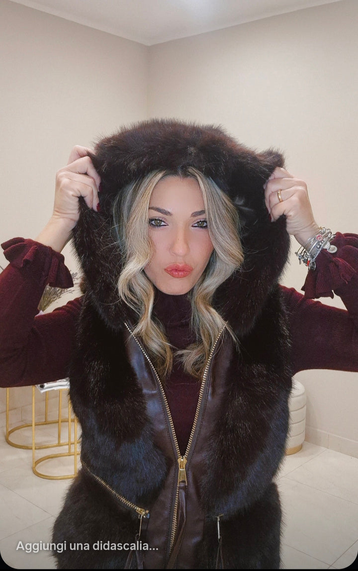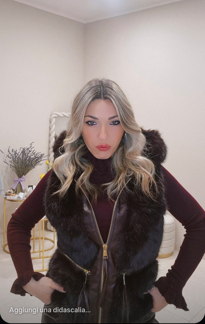Smanicato in pelliccia: un capo audace e distintivo che combina ecopelle strutturata con pelliccia morbidissima, creando un contrasto affascinante. Questo smanicato rappresenta una scelta consapevole per chi sa riconoscere l'unicità e desidera un pezzo che catturi l'attenzione con personalità. La texture vellutata della pelliccia abbinata alla solidità dell'ecopelle garantisce comfort e durabilità, mentre il design senza maniche lo rende straordinariamente versatile. Un capo che trasforma qualsiasi outfit in una dichiarazione di stile audace e raffinato.