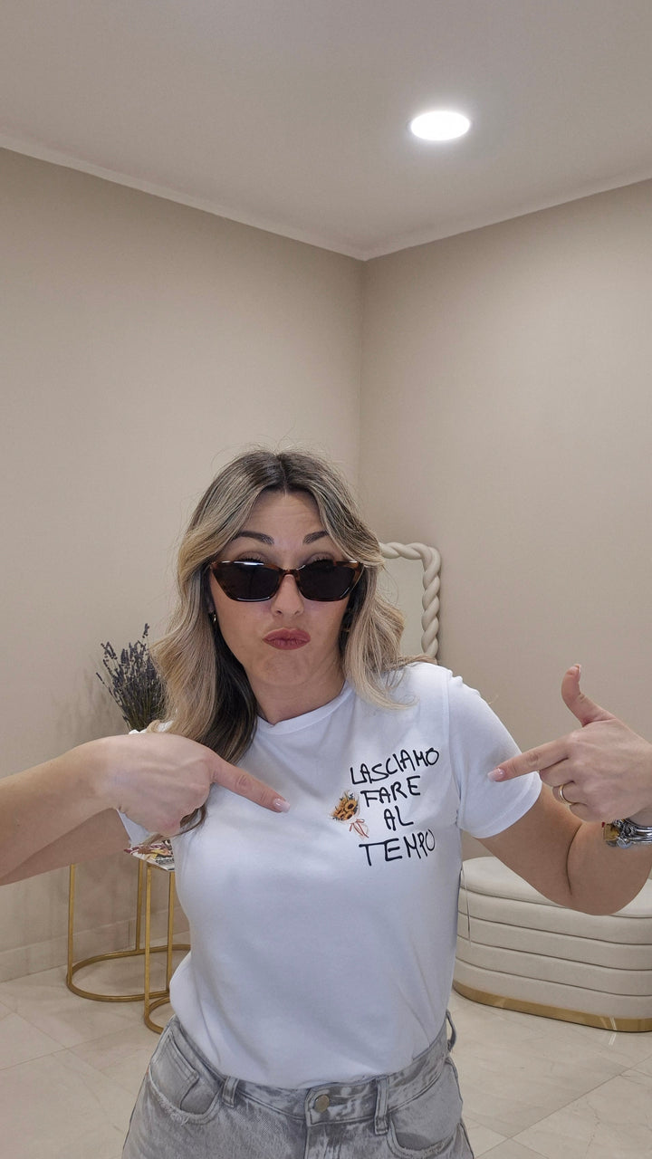 Questa t-shirt in cotone è caratterizzata da una frase speciale "lasciamo fare al tempo". Realizzata con materiali di alta qualità, è comoda e leggera. Mostra al mondo la tua filosofia di vita e lascia che il tempo faccia il suo corso.