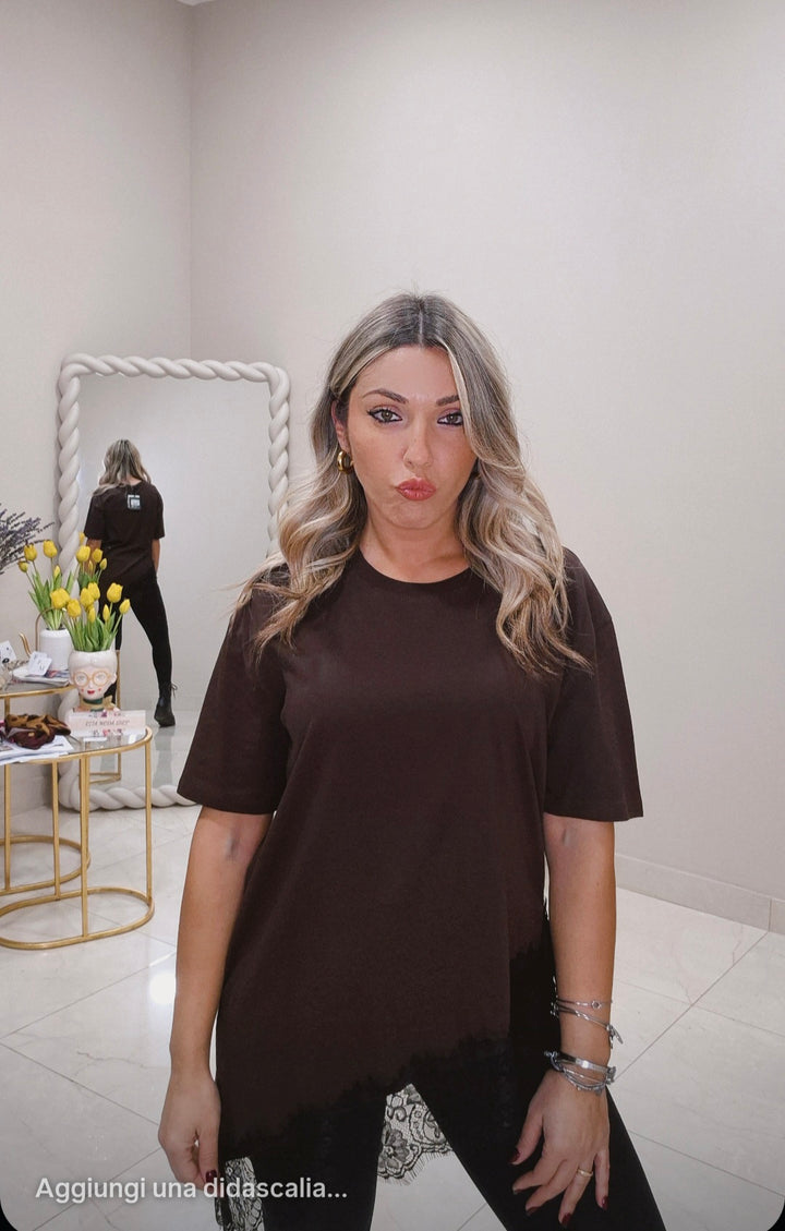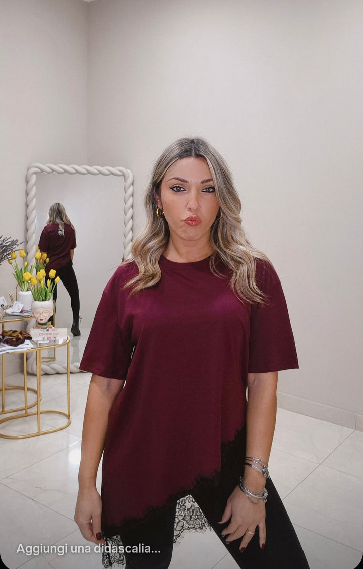 T-shirt Lumina Flo realizzata in cotone pregiato che garantisce morbidezza e traspirabilità. Il design distintivo presenta un taglio trasversale che crea un effetto dinamico e moderno, mentre la finitura in pizzo aggiunge un tocco di eleganza sofisticata. Perfetta per chi ricerca qualità artigianale e dettagli raffinati nel proprio guardaroba quotidiano.
