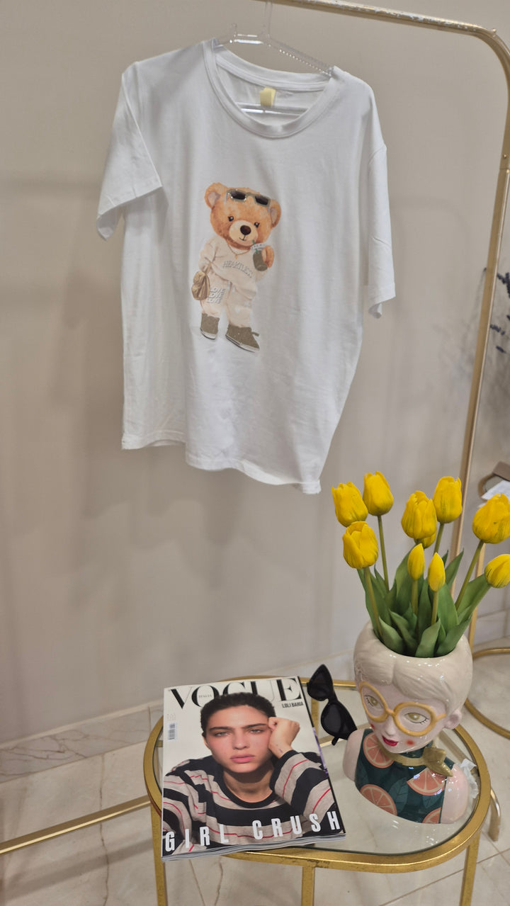 Questa t-shirt in cotone fresco è perfetta per il clima estivo. Il suo design di tendenza con un orso simpatico e scintillante al centro la rende unica e divertente. Indossala per un look fresco e alla moda.