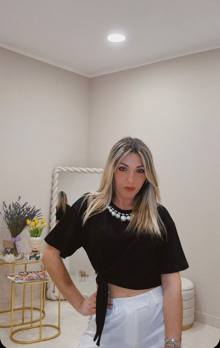 La T-shirt Perla è un capo unico e versatile che si distingue per il suo stile elegante e originale. Grazie alla possibilità di fare un nodino sul lato, si adatta perfettamente alla tua silhouette, mentre le perle intorno al collo creano l'effetto di una collana che aggiunge un tocco di raffinatezza. La scelta perfetta per chi ama essere alla moda senza rinunciare alla comodità.