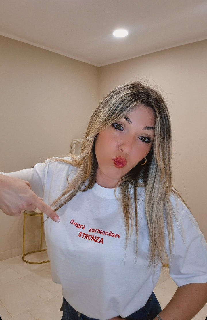 Una t-shirt unica per rendere il tuo outfit speciale. Con la scritta ironica "segni particolari stronza", mostra il tuo stile unico e originale. Aggiungi un tocco di ironia al tuo guardaroba con questa t-shirt.