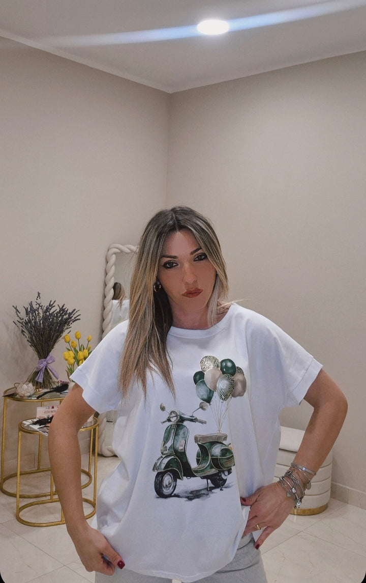 Indossa la nostra confortevole t-shirt in fresco cotone con una stampa iconica della Vespa. La vestibilità perfetta e il materiale di qualità ti faranno sentire elegante e comodo. Aggiungi un tocco di classe al tuo look con questa maglietta unica.