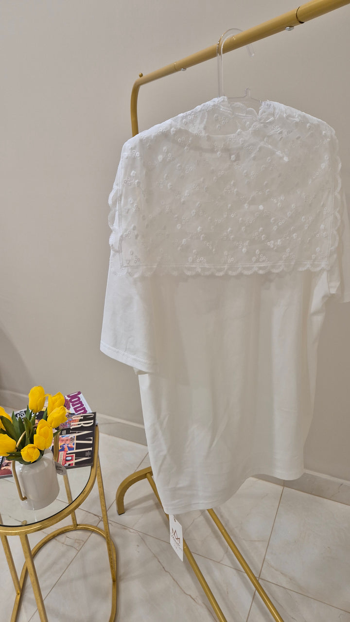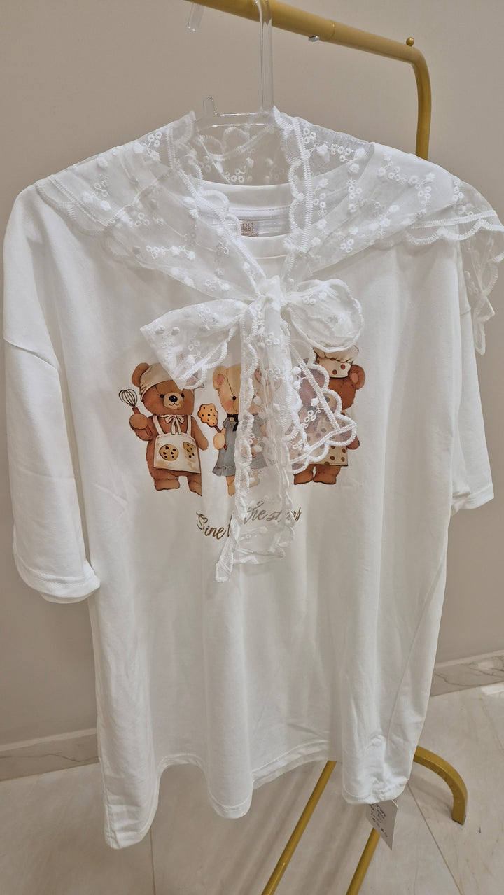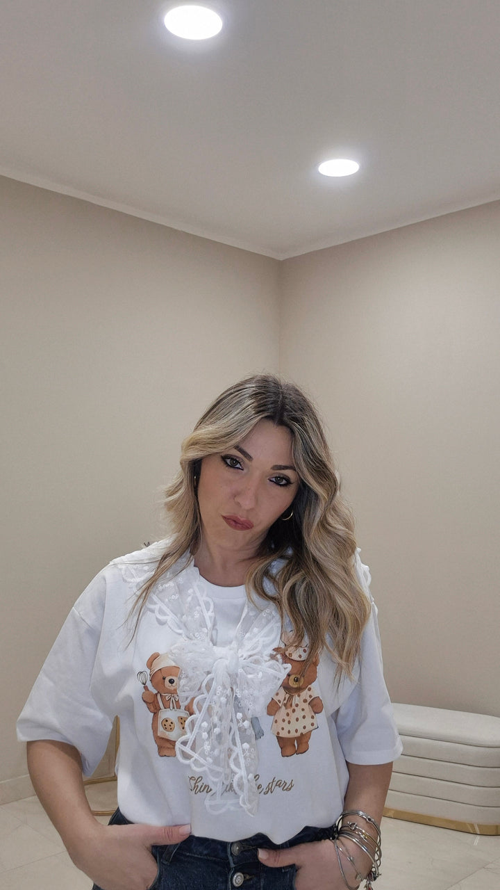 Indossa questa t-shirt di cotone con tre tenerissimi teddy e una mantellina in pizzo che crea un fiocco sul davanti. Aggiungi un tocco dolce e unico al tuo look. Realizzata con materiali di qualità per un comfort assoluto. Perfetta per ogni occasione.