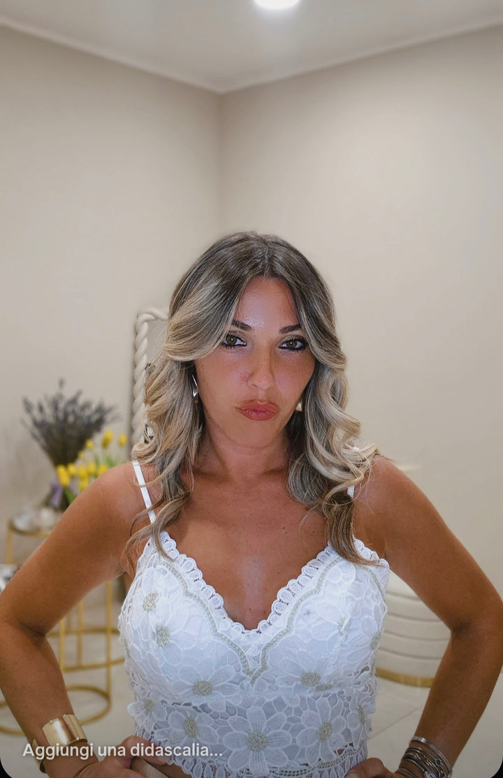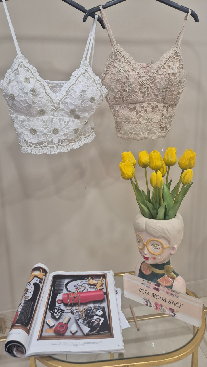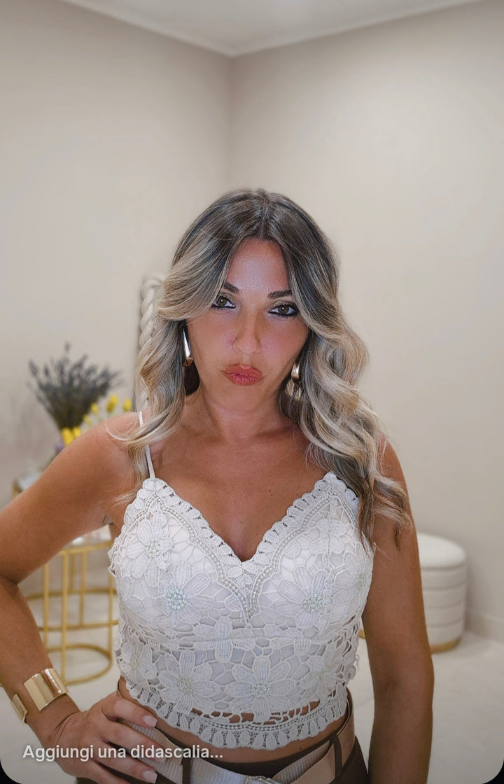 Questo top si distingue per il ricamo con delicati richiami floreali che aggiungono un tocco di raffinatezza. Lo scollo è studiato per valorizzare il décolleté, conferendo al capo un’eleganza discreta e femminile, ideale per completare look sofisticati e di tendenza.