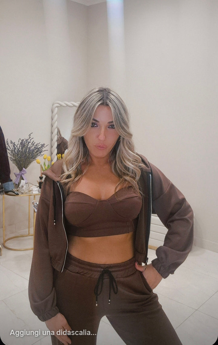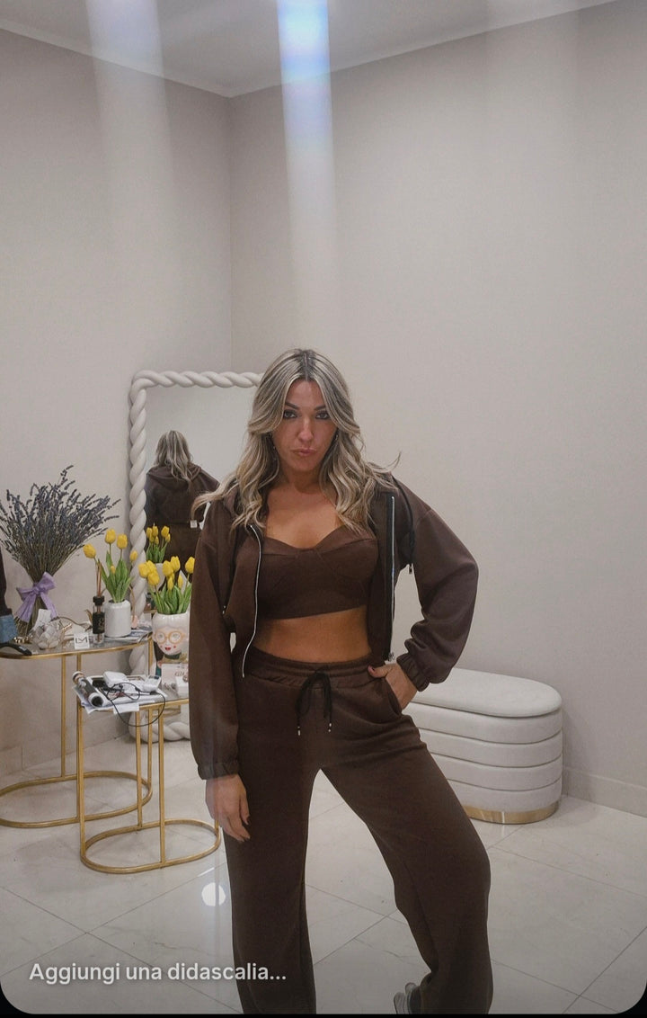 La tuta Giada è un completo in tre pezzi che include pantalaccio, top corto e felpa, pensato per mantenere uno stile femminile anche nel comfort dell’abbigliamento casual. Ogni capo è studiato per garantire vestibilità e praticità senza rinunciare a un’estetica elegante e contemporanea, perfetta per chi desidera un look coordinato versatile e di carattere.