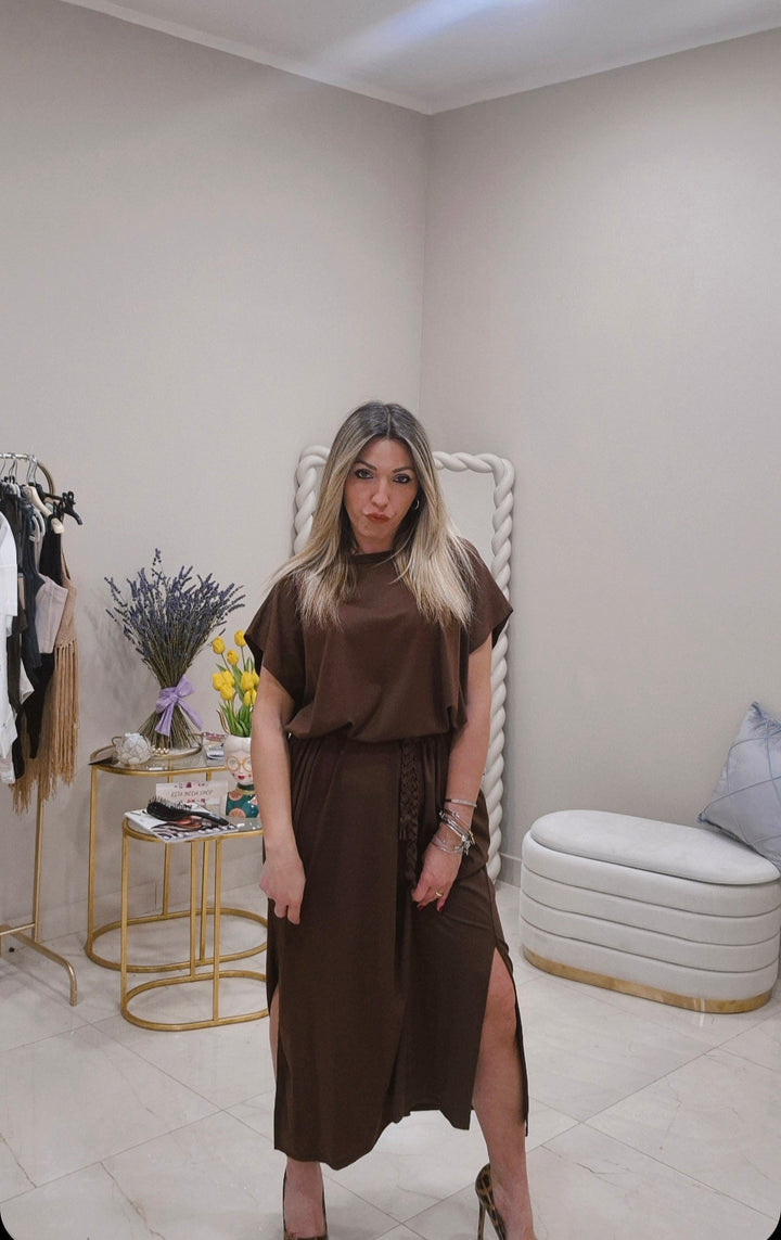 Il Vestito Fabry è perfetto per un look elegante e pratico. Realizzato con un tessuto confortevole di alta qualità, questo vestito lungo presenta un cinturino alla vita che valorizza la silhouette e spacchi laterali per muoversi con facilità. Comodo e versatile, ideale per ogni occasione.