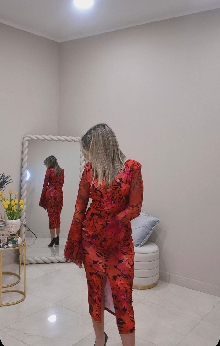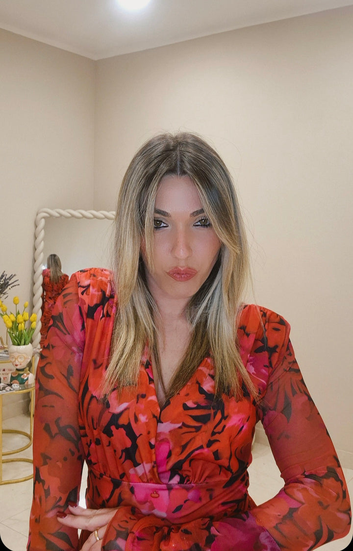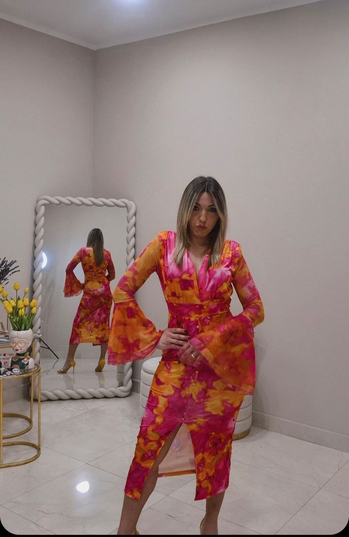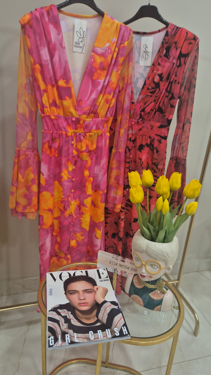 Vestito lungo estivo caratterizzato da una vivace palette di colori. Presenta un'elegante chiusura frontale con bottoni decorativi e uno strategico spacco centrale che slancia la figura. Le maniche in tessuto velato aggiungono leggerezza e raffinatezza. Flora è un capo distintivo che combina comfort e stile per un look sofisticato nelle giornate calde.