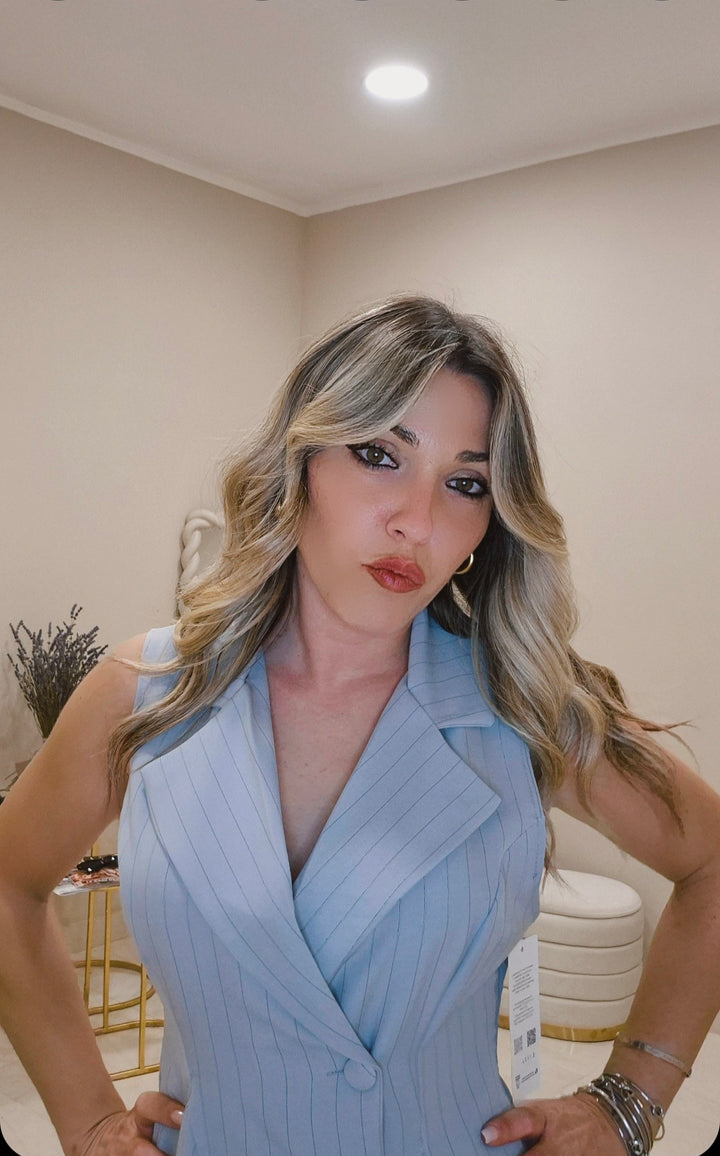 Questo vestito onda senza maniche è perfetto per l'estate. Realizzato con tessuti di alta qualità, offre un look elegante e moderno. Comodo e leggero, è adatto per ogni occasione. Con il suo design unico a giacca, dona un tocco di originalità al tuo outfit.