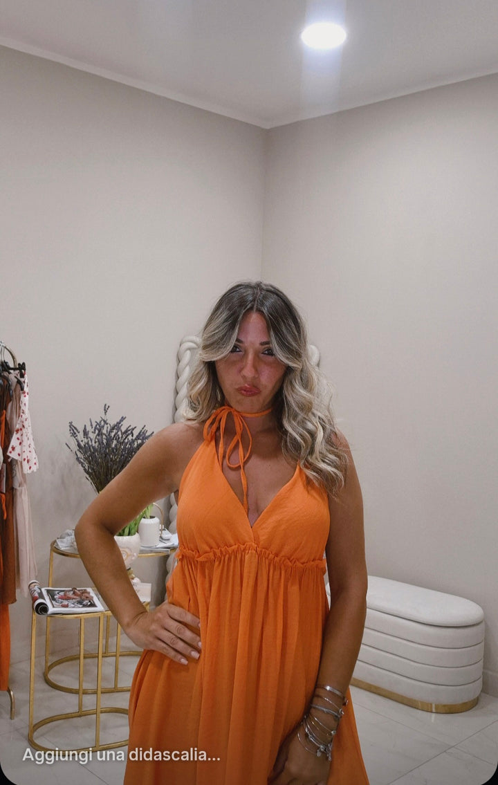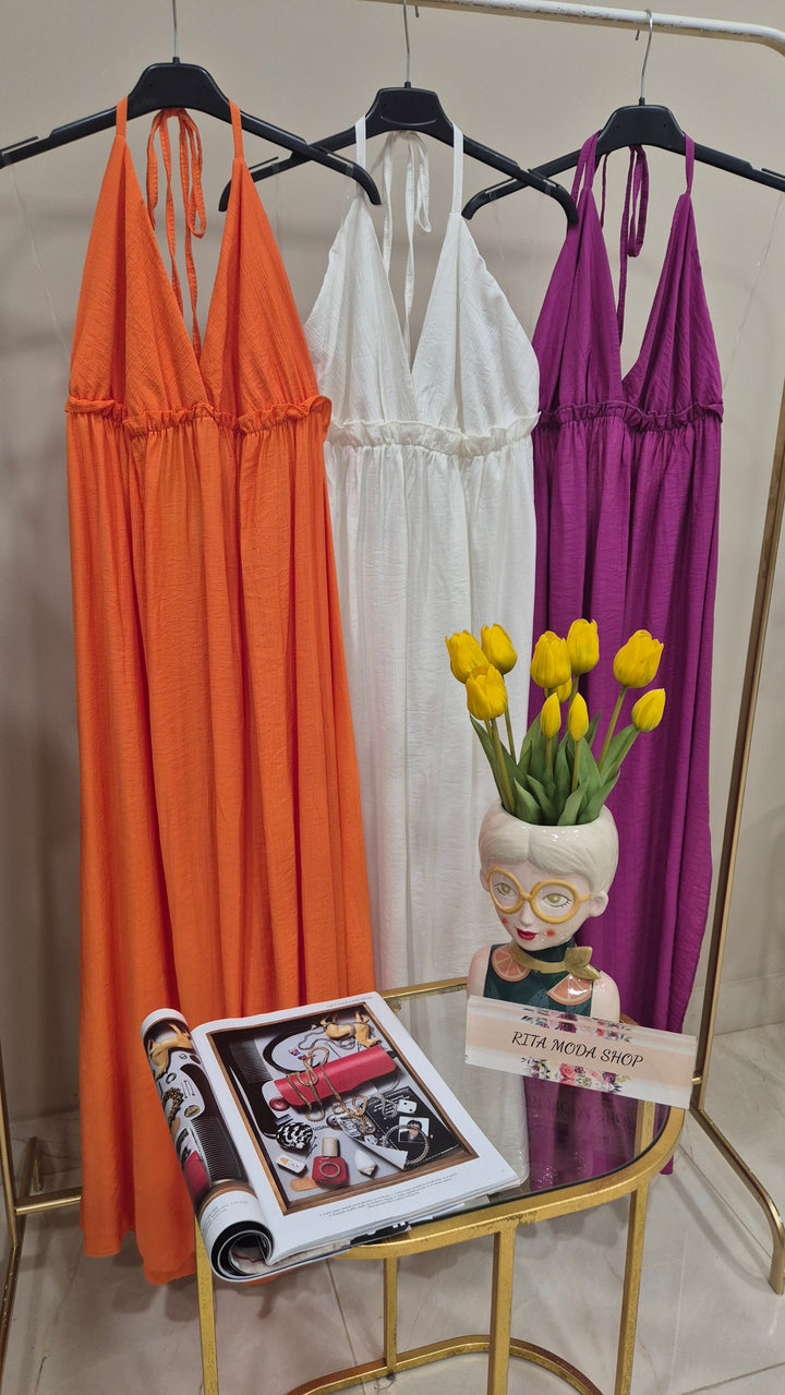 Questo vestito lungo presenta spacchi laterali che donano movimento e un tocco di sensualità. Lo scollo è progettato per valorizzare il décolleté, mentre i laccetti regolabili sul collo permettono una vestibilità personalizzata, unendo comfort e stile in un capo elegante e versatile.
