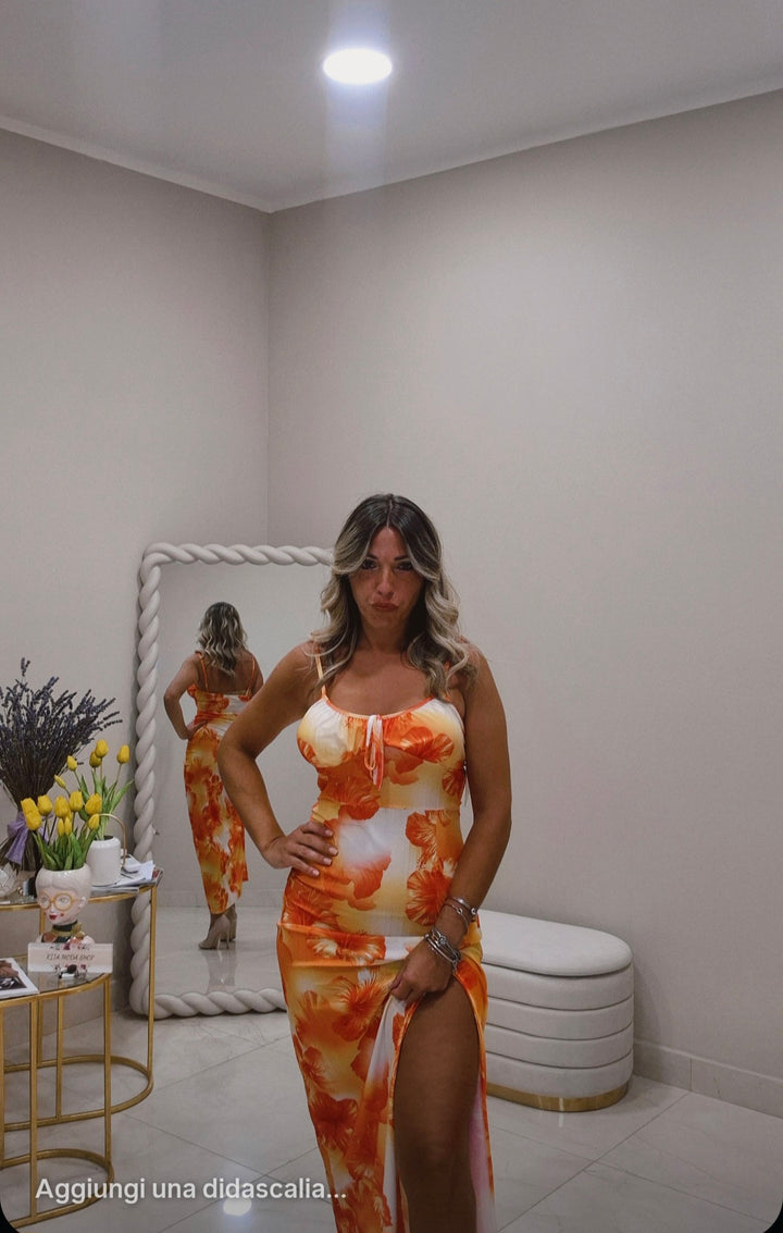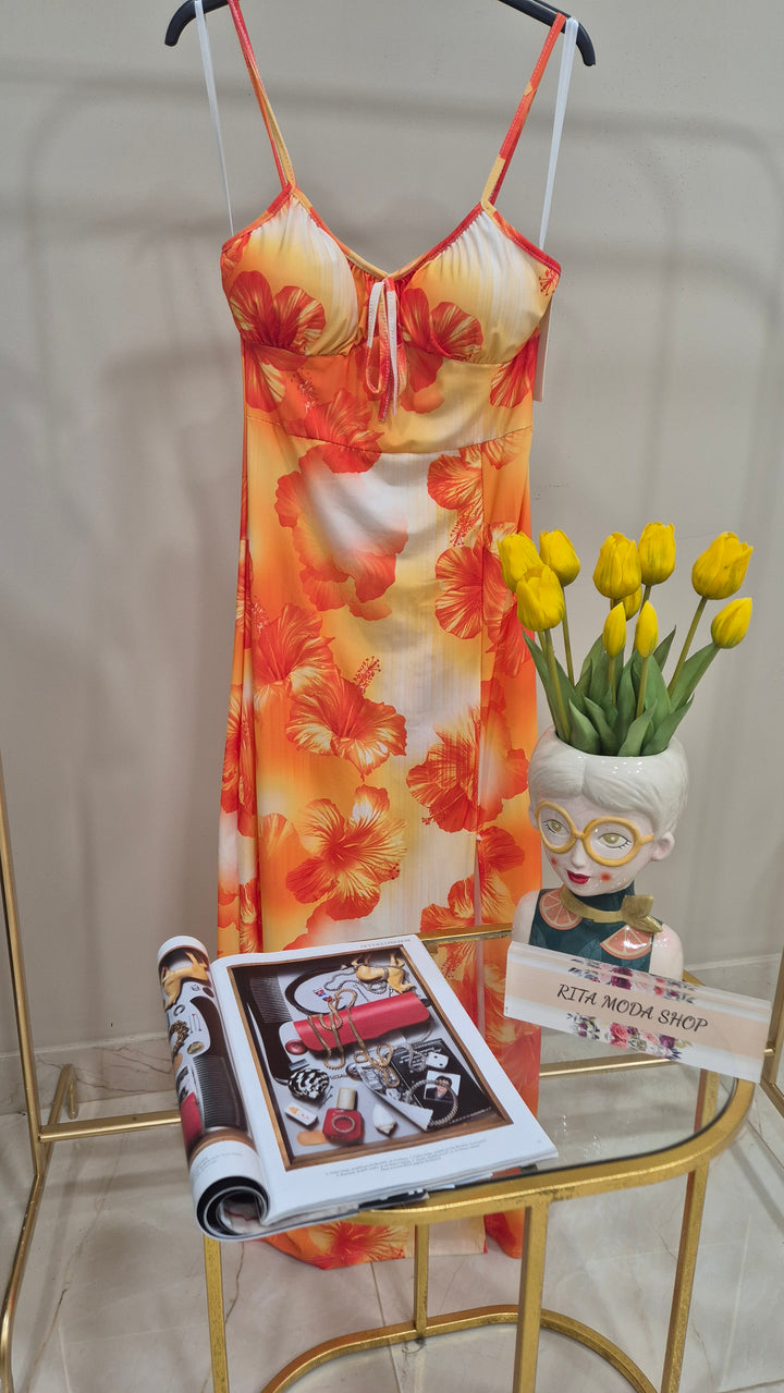 Questo vestito lungo si distingue per una vestibilità impeccabile che valorizza la silhouette. Il frontale con spacco aggiunge un tocco di sensualità, mentre lo scollo è studiato per esaltare il décolleté con eleganza. I colori, ispirati ai caldi toni del tramonto, rendono questo capo perfetto per vivere un’estate all’insegna dello stile e della raffinatezza.